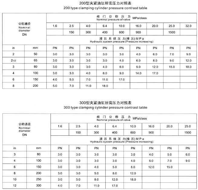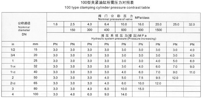 四、測試閥門時,首先應根據(jù)被試閥門試驗要求,參照《夾緊油缸所需壓力對照表》進行所需壓力增壓調(diào)節(jié)。嚴禁增壓超高
