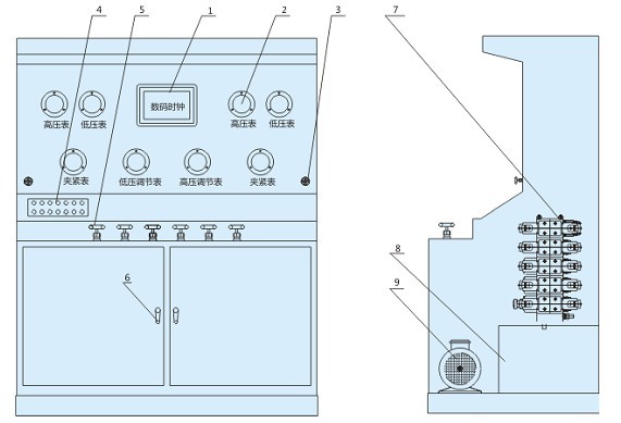 4. 按鈕操作板 5. 水氣控制閥門開關(guān)6. 高低壓水泵柜