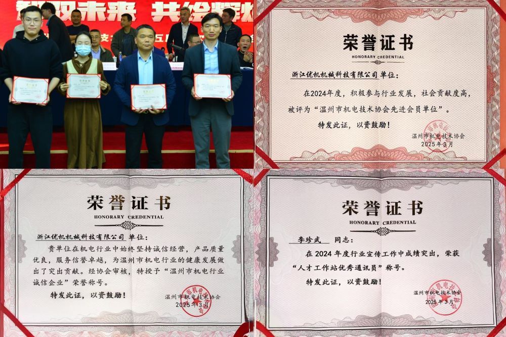 326日,在溫州市機(jī)電技術(shù)協(xié)會(huì)五屆三次會(huì)員大會(huì)上,浙江優(yōu)機(jī)機(jī)械科技有限公司憑借卓越表現(xiàn),榮獲2024年度"溫州市機(jī)電行業(yè)誠(chéng)信企業(yè)""溫州市機(jī)電技術(shù)協(xié)會(huì)先進(jìn)單位"兩項(xiàng)榮譽(yù)稱號(hào)。公司總經(jīng)理李珍武同時(shí)獲評(píng)"機(jī)電協(xié)會(huì)人才工作站優(yōu)秀通訊員"稱號(hào)。